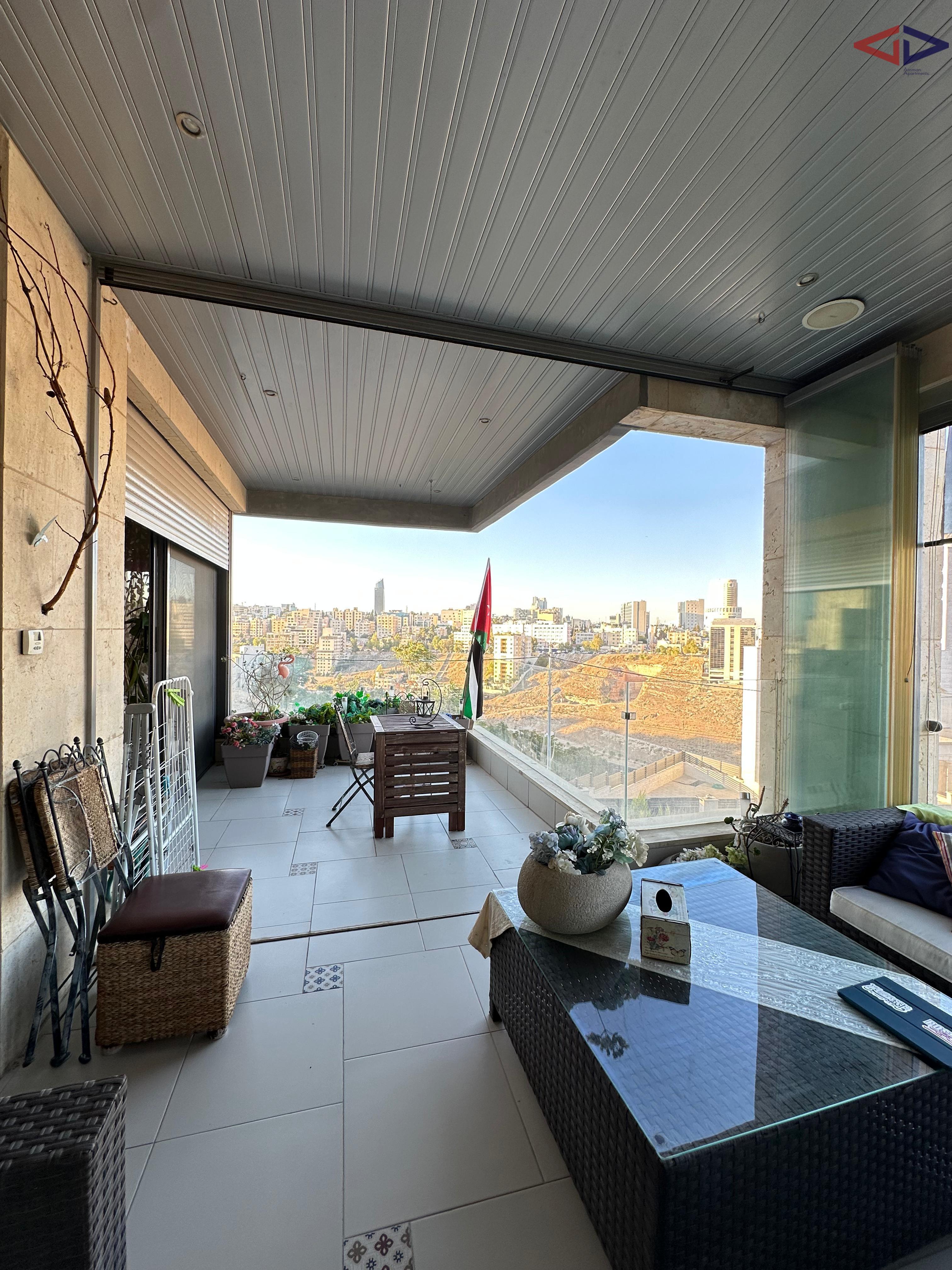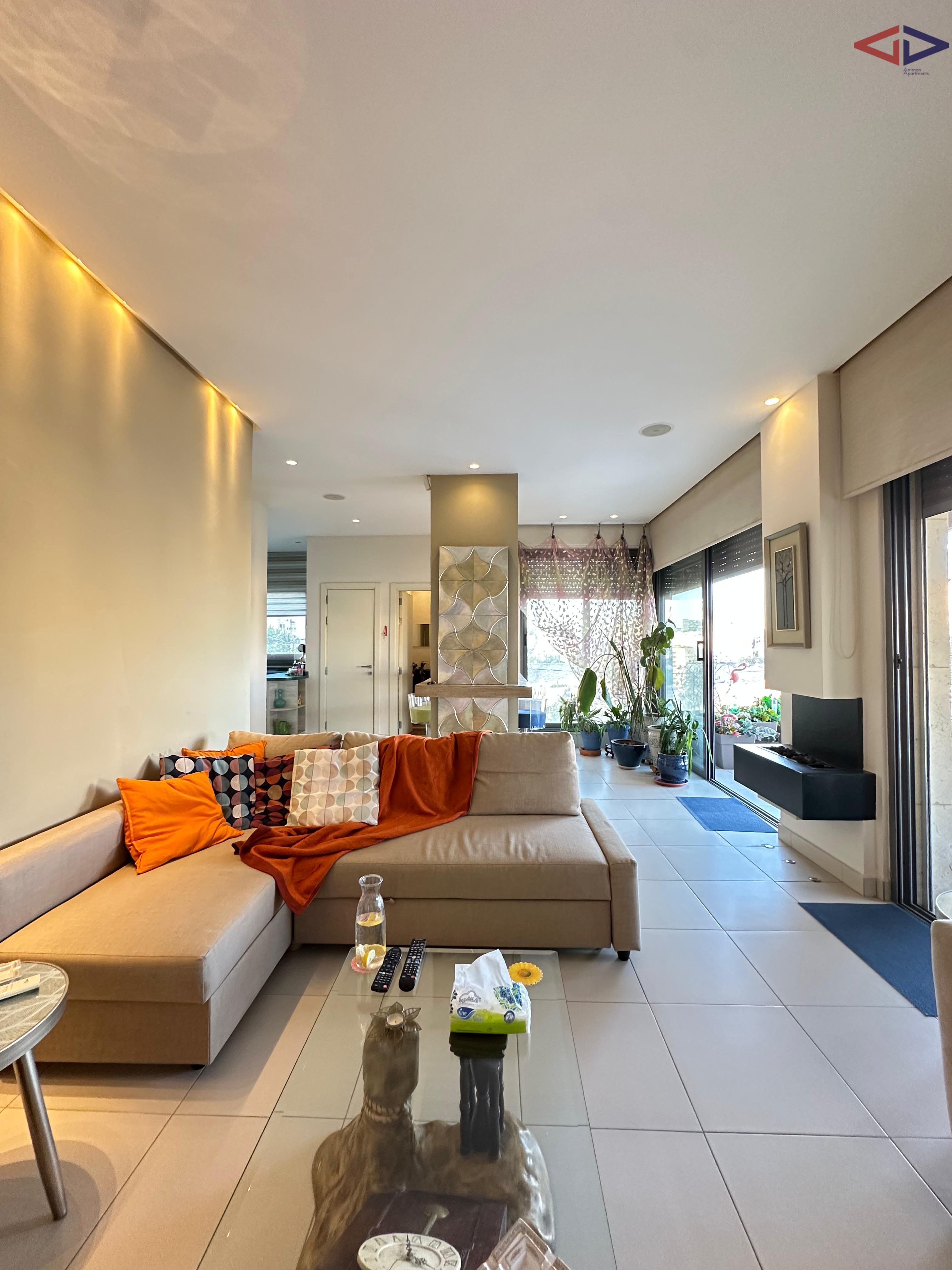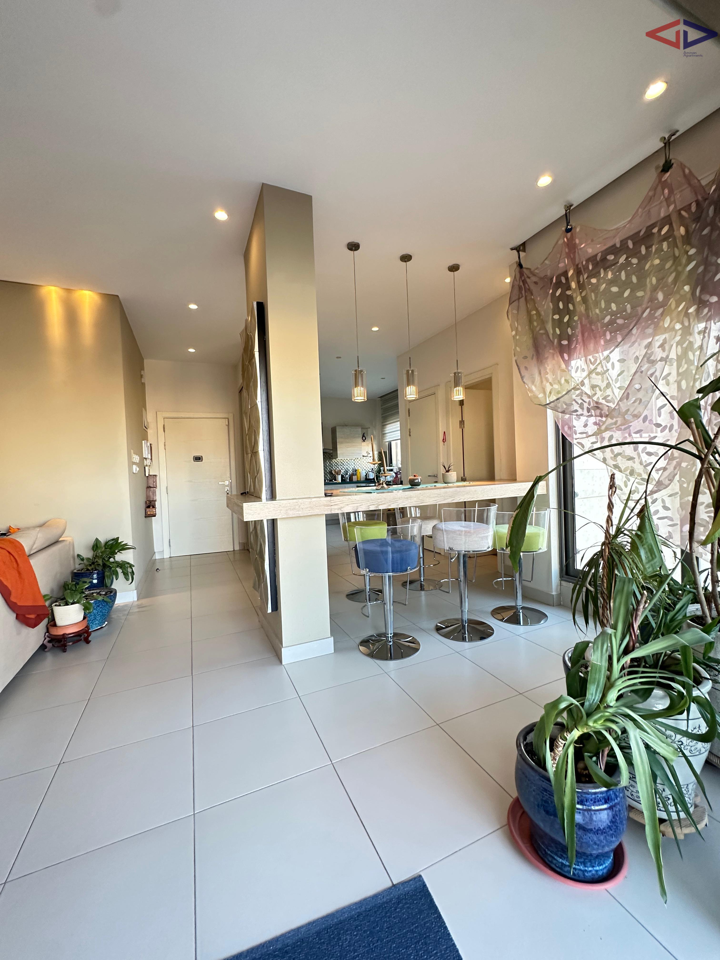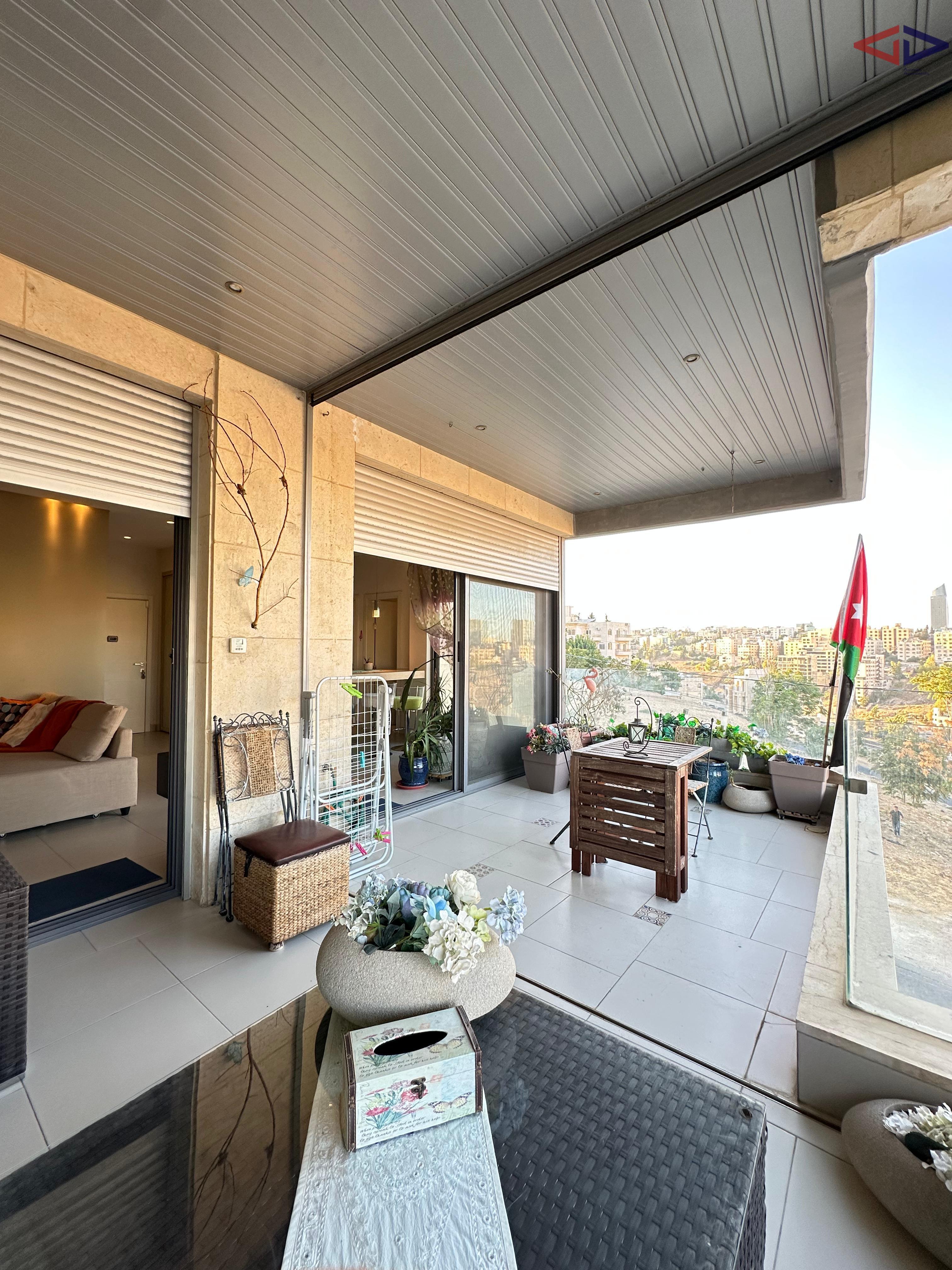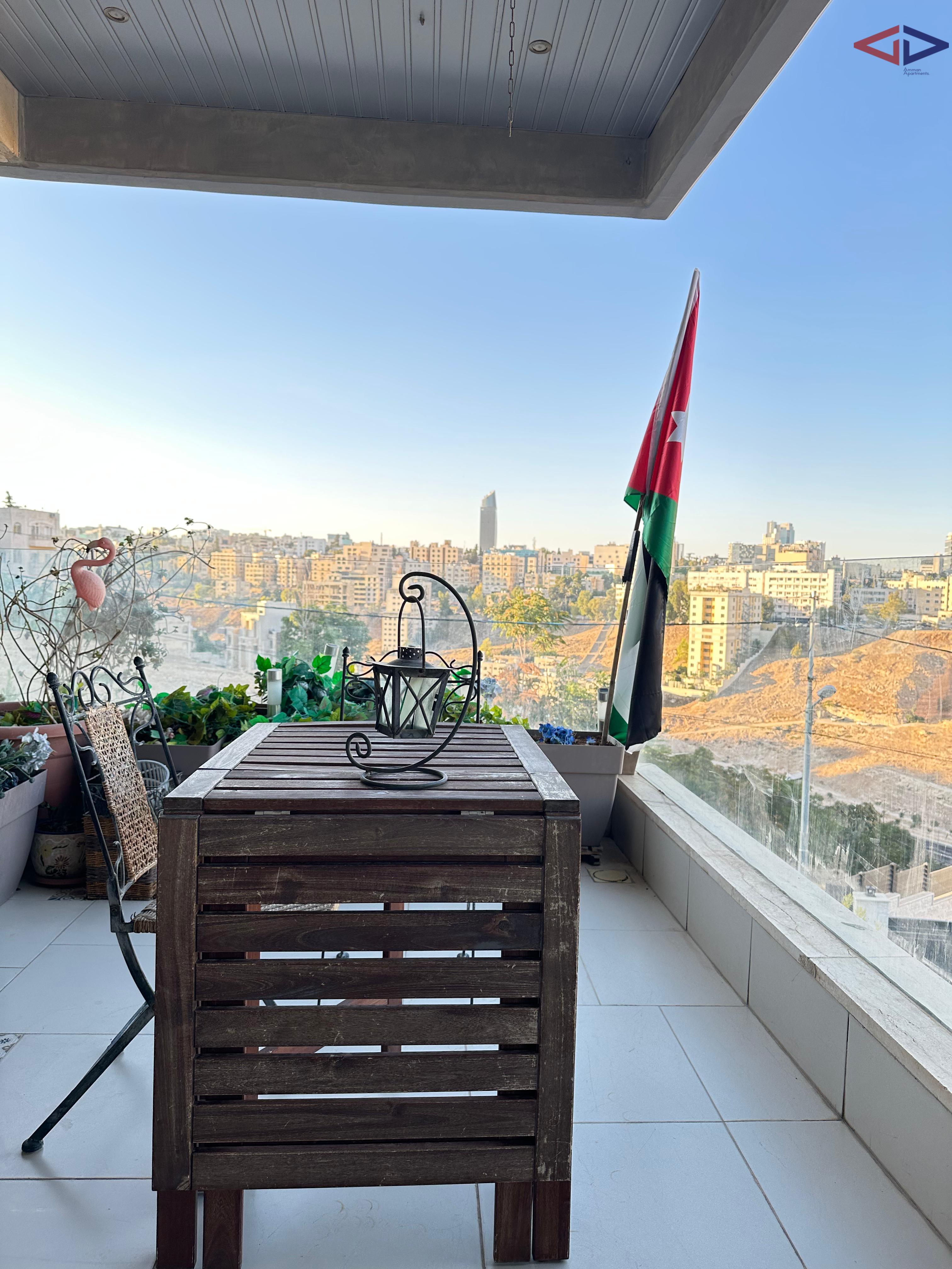 Luxurious 120 sqm one-bedroom apartment for long-term rent in Abdoun, located near Abdoun Circle within the prestigious embassies district, opposite the Embassy of Lebanon in Amman. This first-floor apartment features a modern open-plan design, two bathrooms, a spacious semi-closed terrace with east-facing views overlooking Jabal Amman and eastern Amman, underfloor heating, solar water heating, two AC units, installed sound system, and two gas fireplaces. The property includes a sofa bed, garage parking, and easy walking access to essential services, making it ideal for comfortable and upscale living in Amman.
