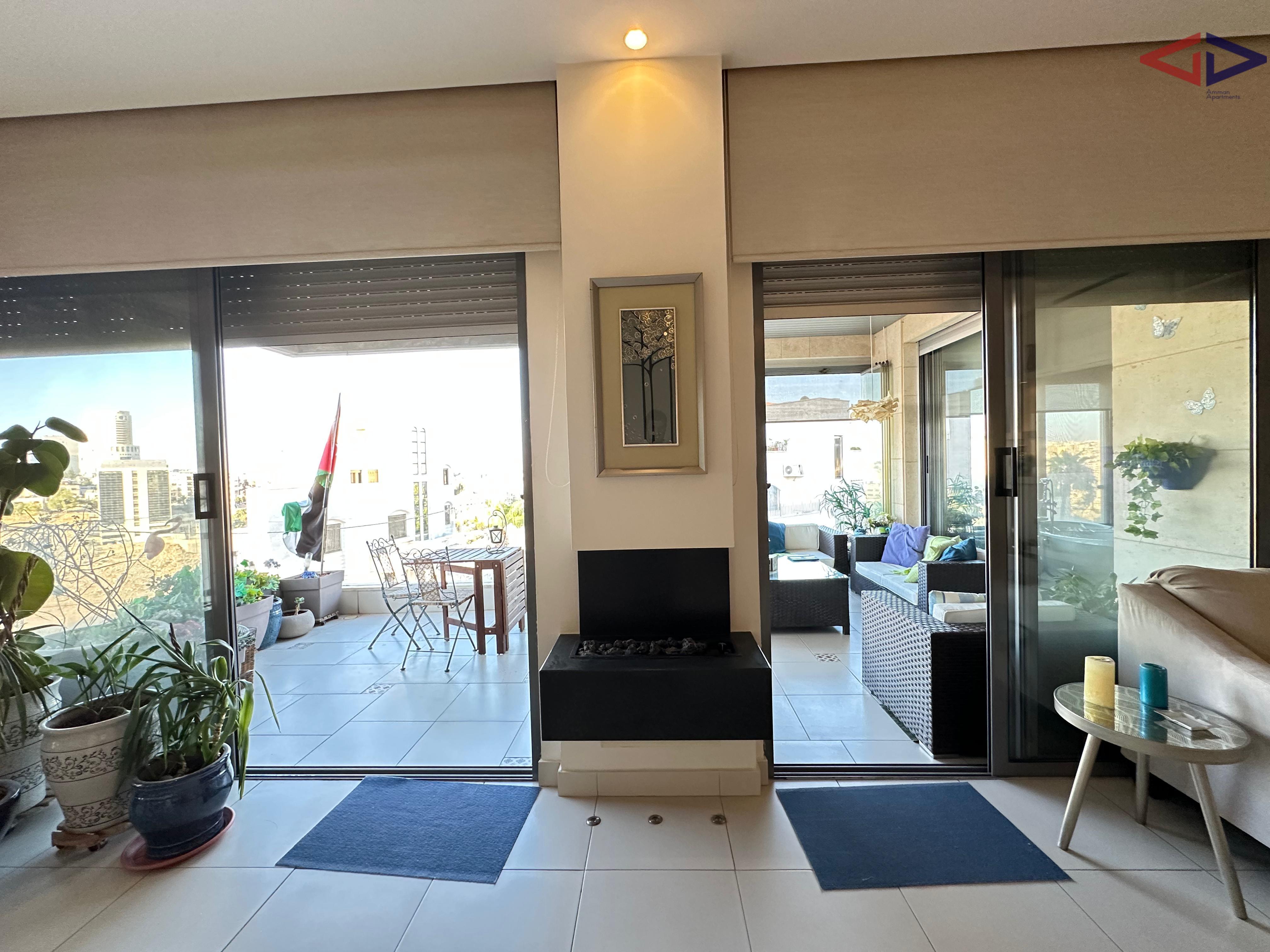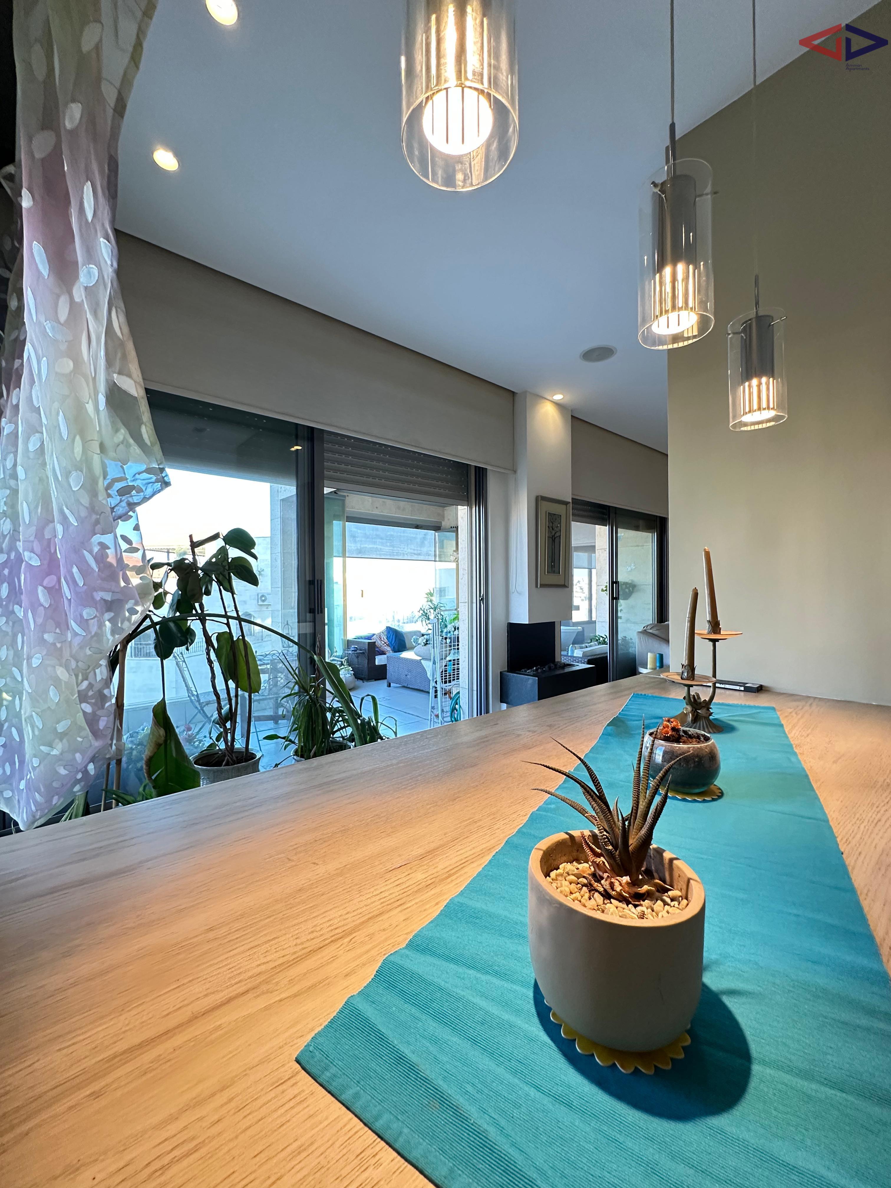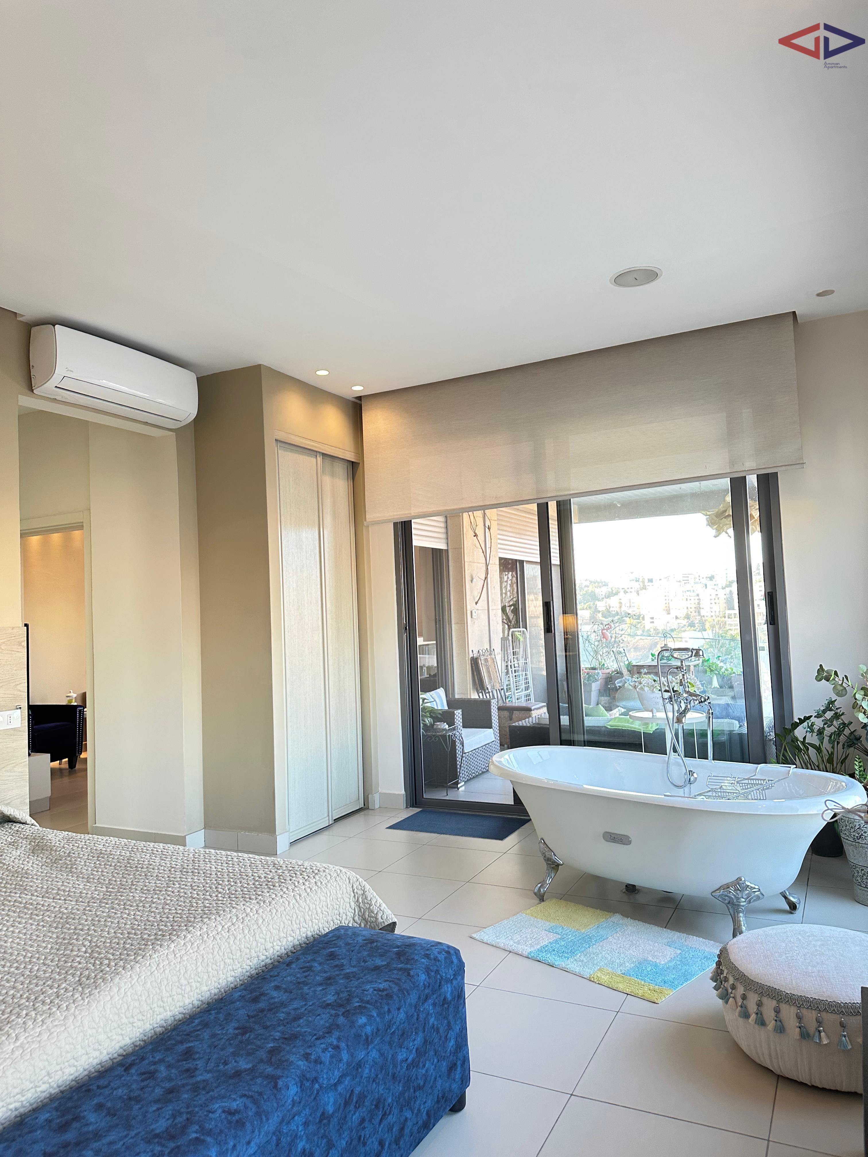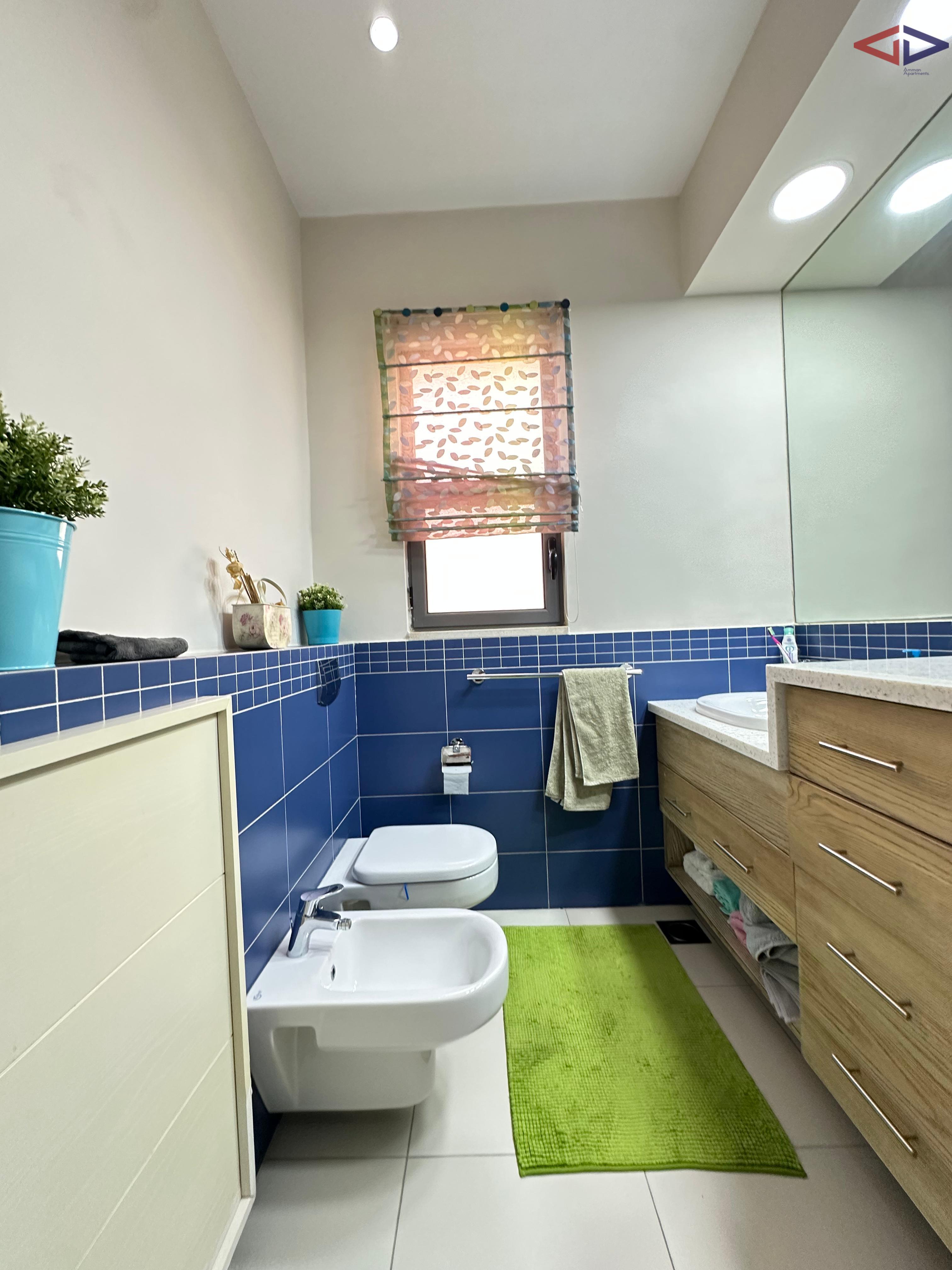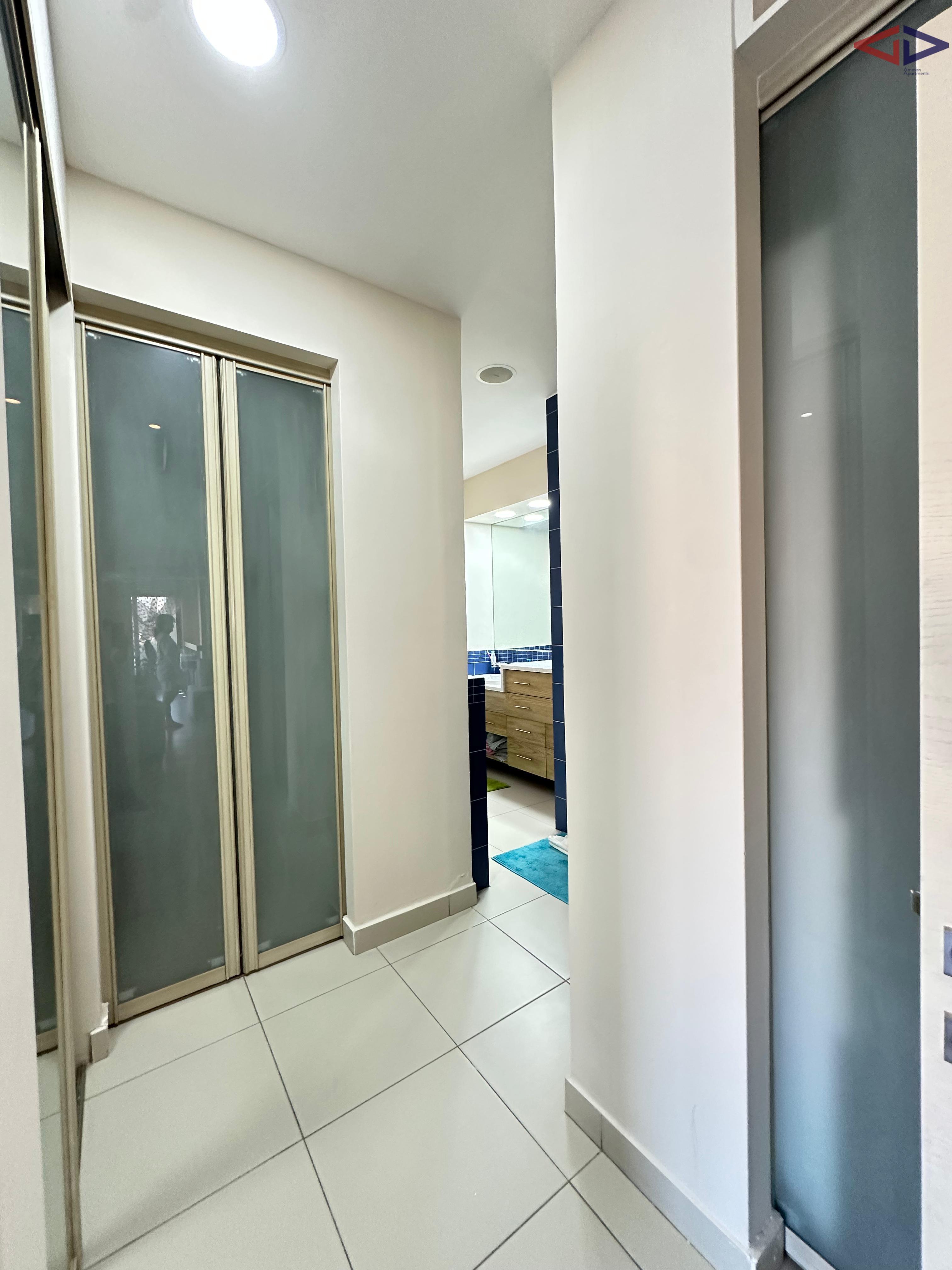 Luxurious 120 sqm one-bedroom apartment for long-term rent in Abdoun, located near Abdoun Circle within the prestigious embassies district, opposite the Embassy of Lebanon in Amman. This first-floor apartment features a modern open-plan design, two bathrooms, a spacious semi-closed terrace with east-facing views overlooking Jabal Amman and eastern Amman, underfloor heating, solar water heating, two AC units, installed sound system, and two gas fireplaces. The property includes a sofa bed, garage parking, and easy walking access to essential services, making it ideal for comfortable and upscale living in Amman.