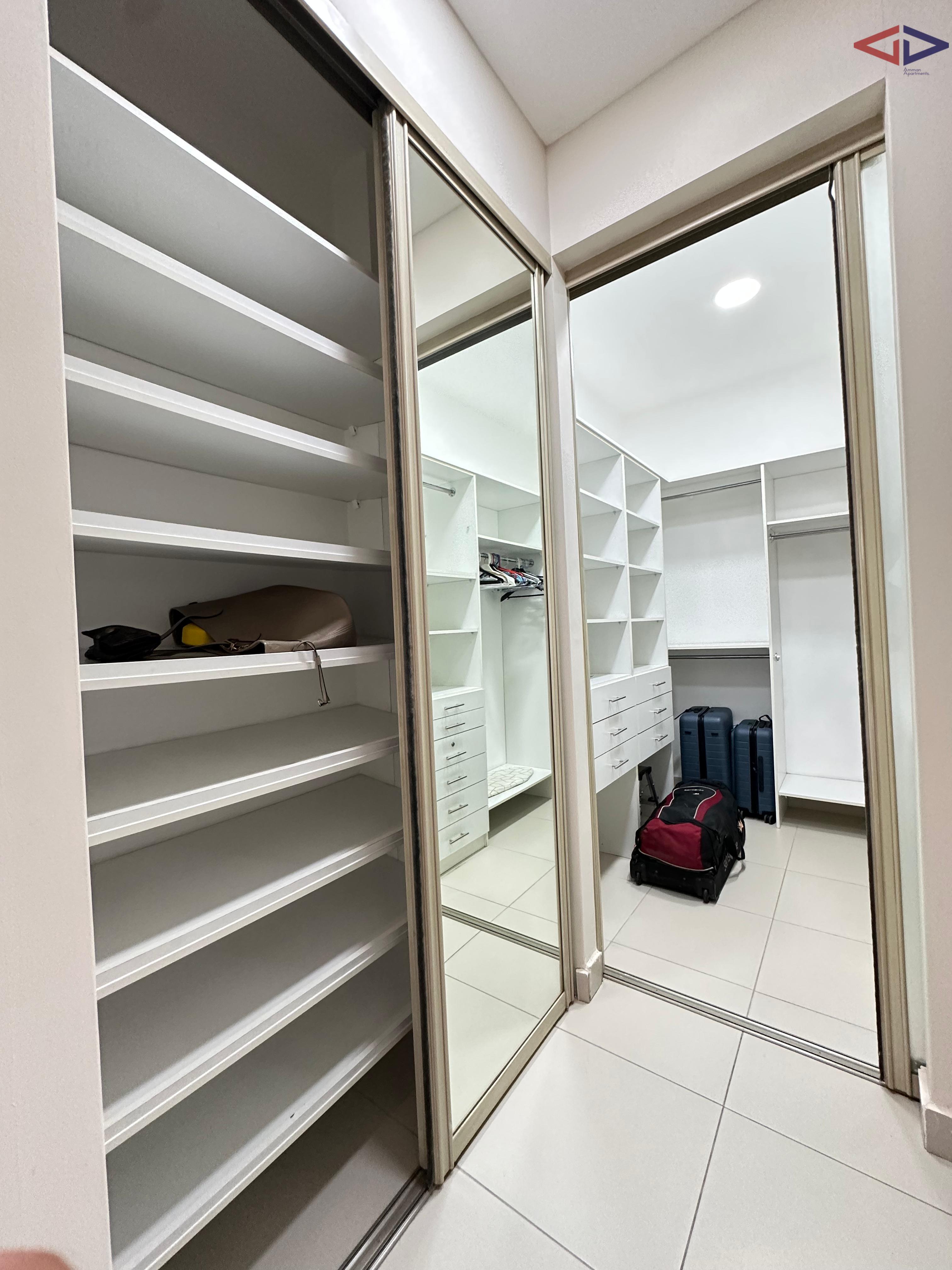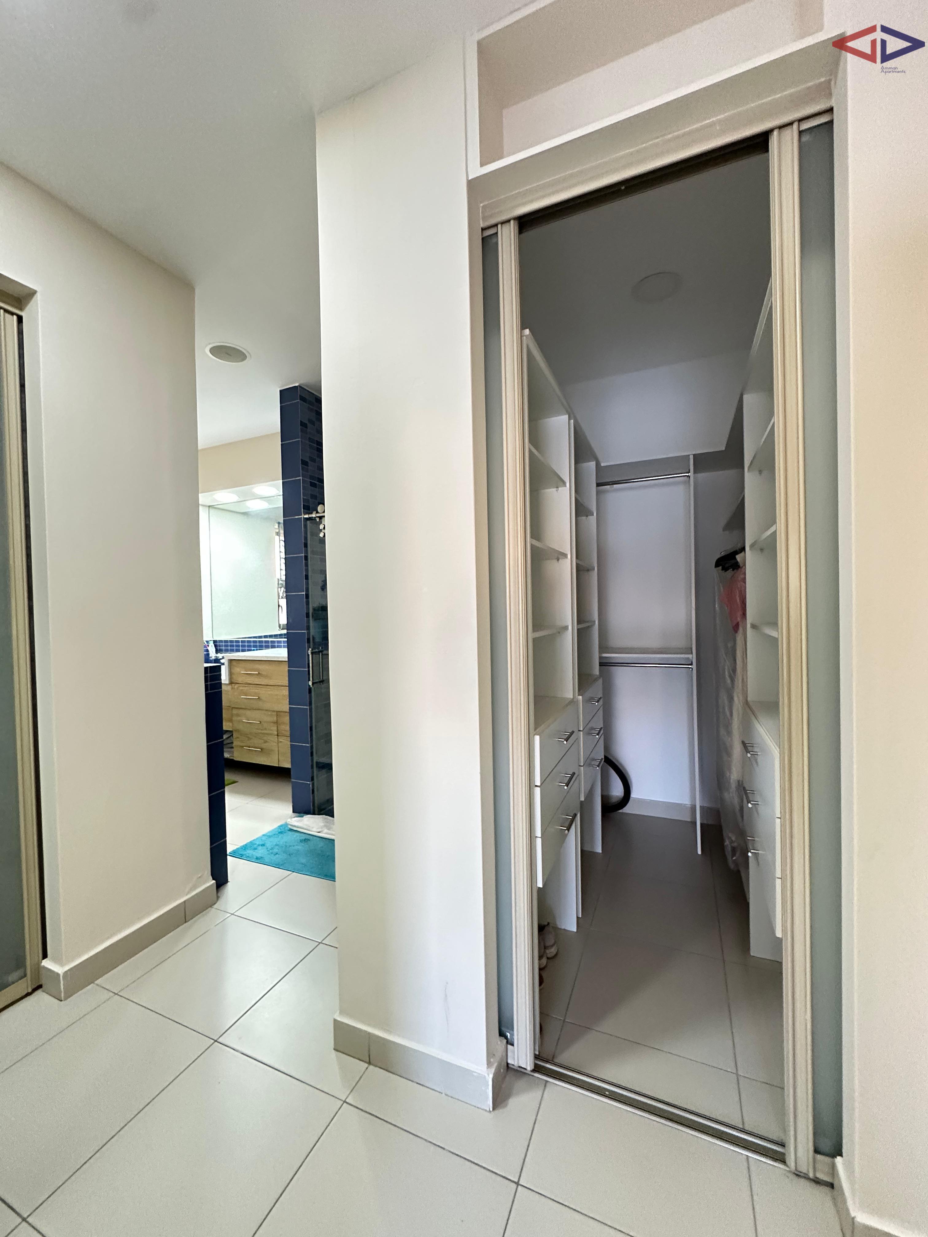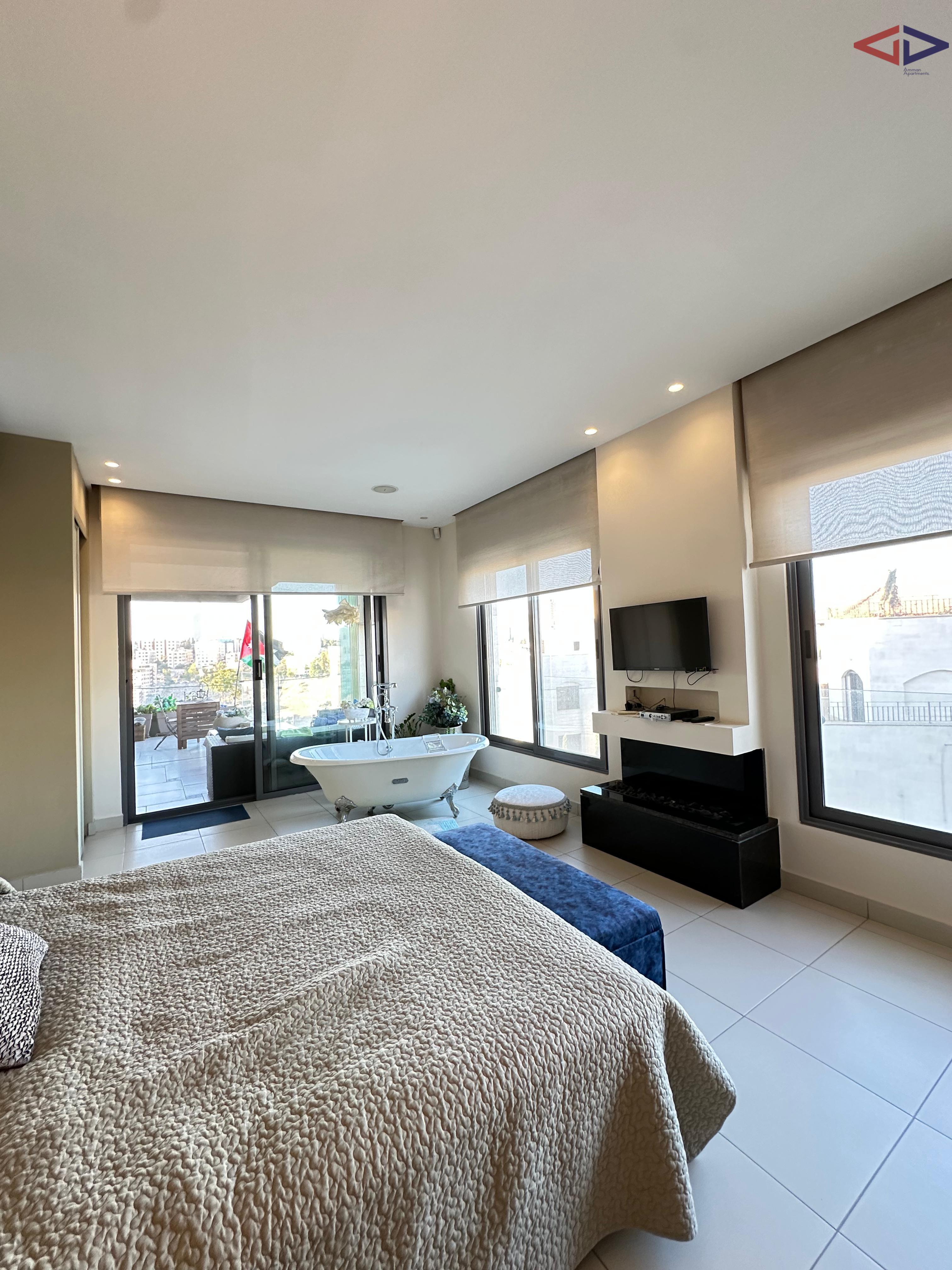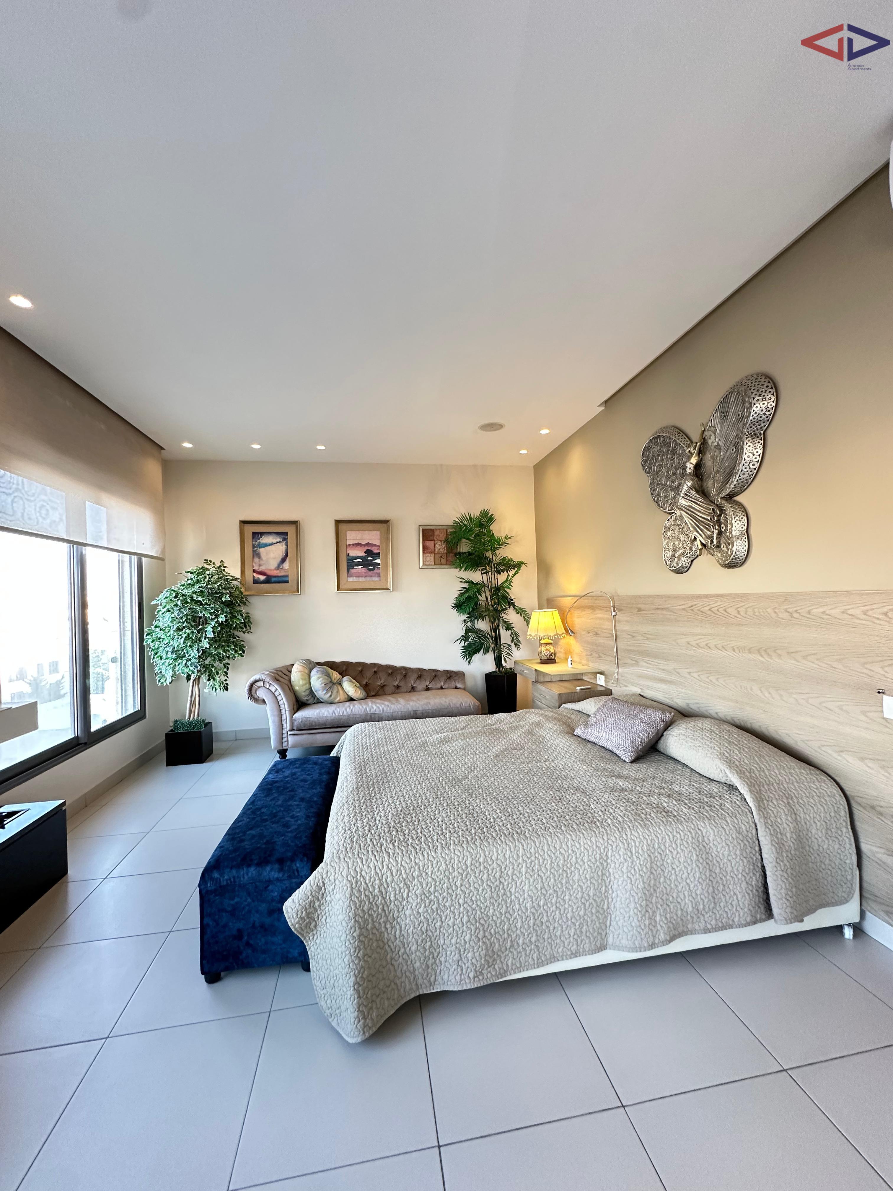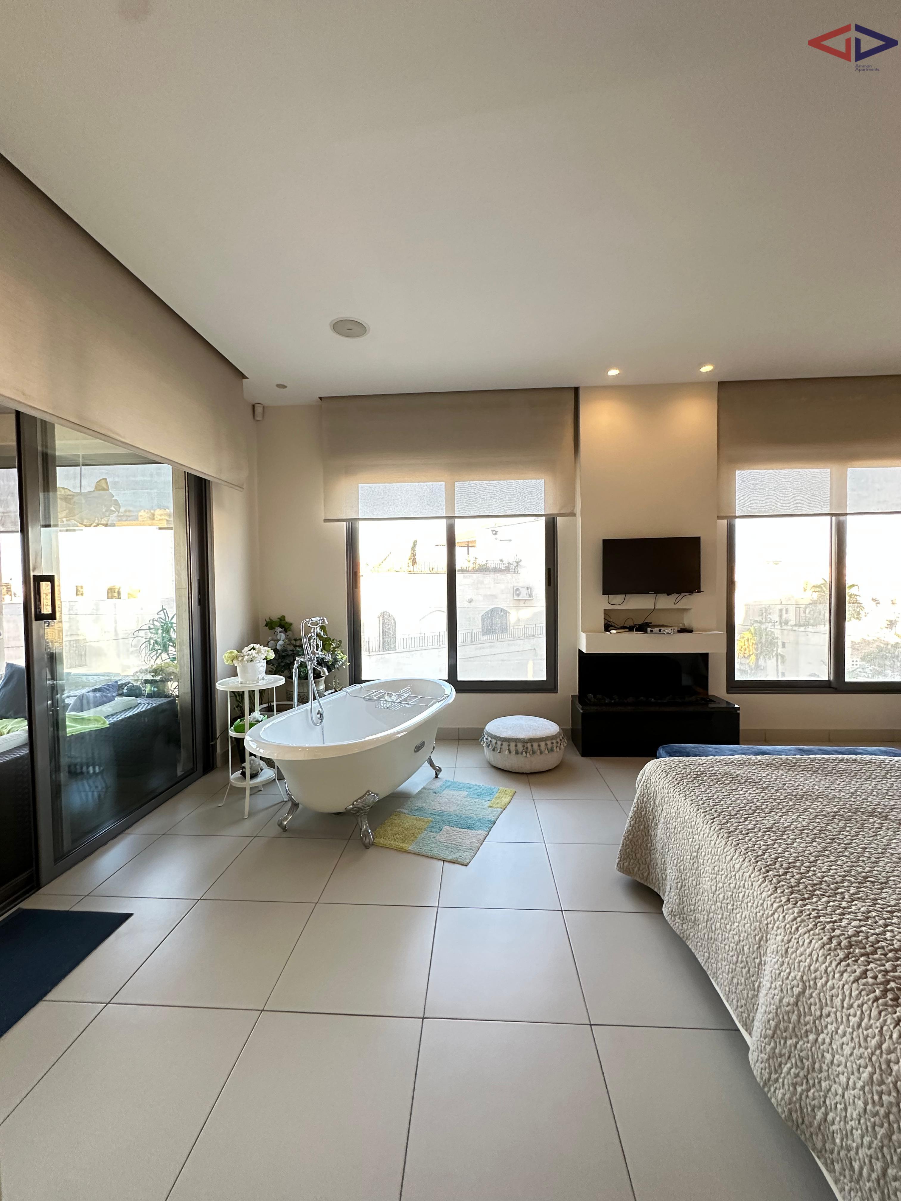 Luxurious 120 sqm one-bedroom apartment for long-term rent in Abdoun, located near Abdoun Circle within the prestigious embassies district, opposite the Embassy of Lebanon in Amman. This first-floor apartment features a modern open-plan design, two bathrooms, a spacious semi-closed terrace with east-facing views overlooking Jabal Amman and eastern Amman, underfloor heating, solar water heating, two AC units, installed sound system, and two gas fireplaces. The property includes a sofa bed, garage parking, and easy walking access to essential services, making it ideal for comfortable and upscale living in Amman.