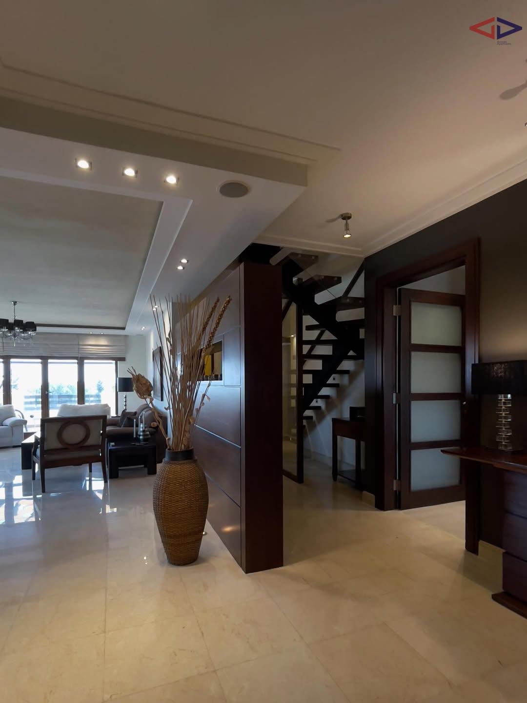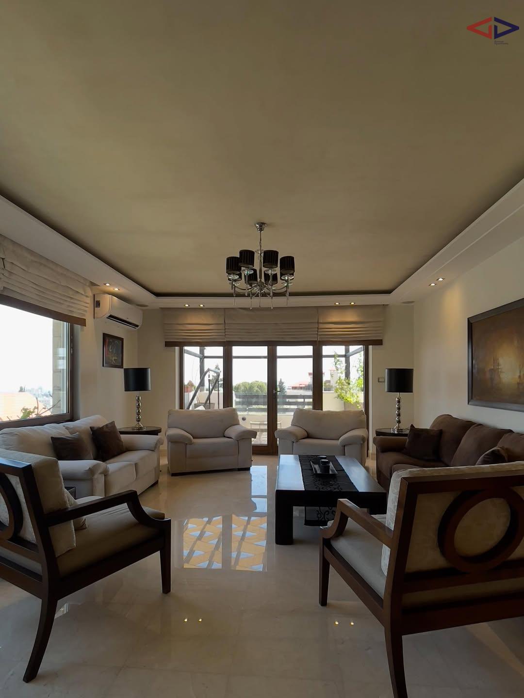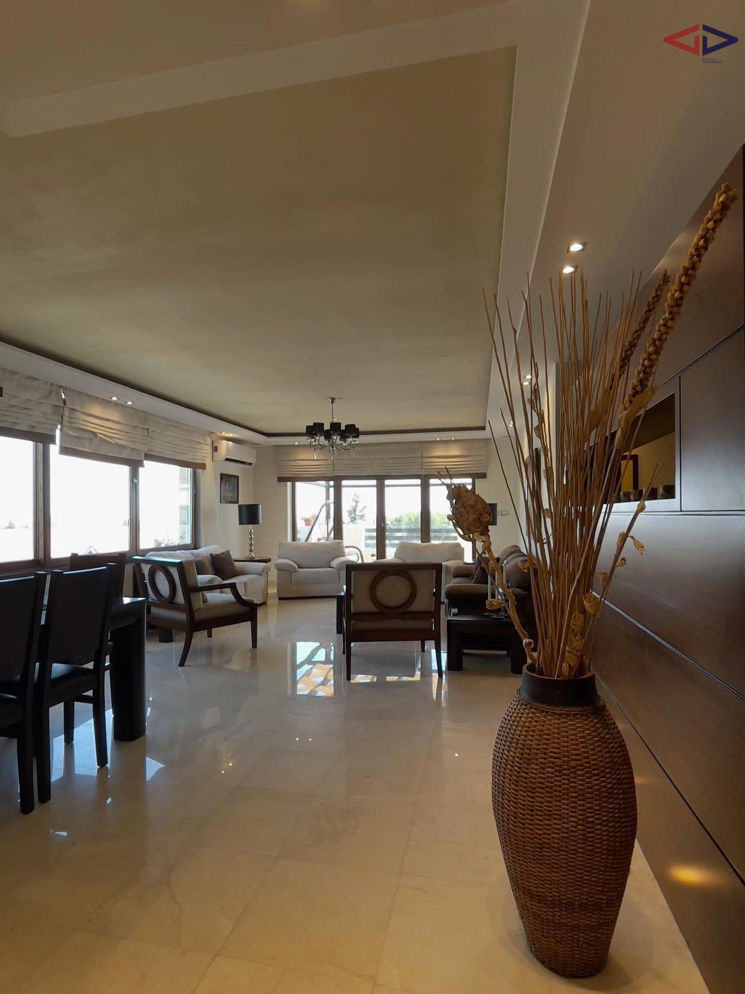 Exceptional duplex roof apartment for rent in Abdoun, Amman, offering 285 m² of interior space and 135 m² of expansive terraces. The apartment features a spacious kitchen with breakfast area, living, dining, and family rooms, laundry room, three bedrooms including a master suite, guest bathroom, and a maid’s room with private bath. Outdoor spaces include multiple terraces and a private roof terrace with BBQ area, jacuzzi, lounge, and dining space, all enjoying breathtaking panoramic views over Amman. Located in an exclusive building with only four units, offering privacy and upscale living in one of Amman’s most prestigious neighborhoods.