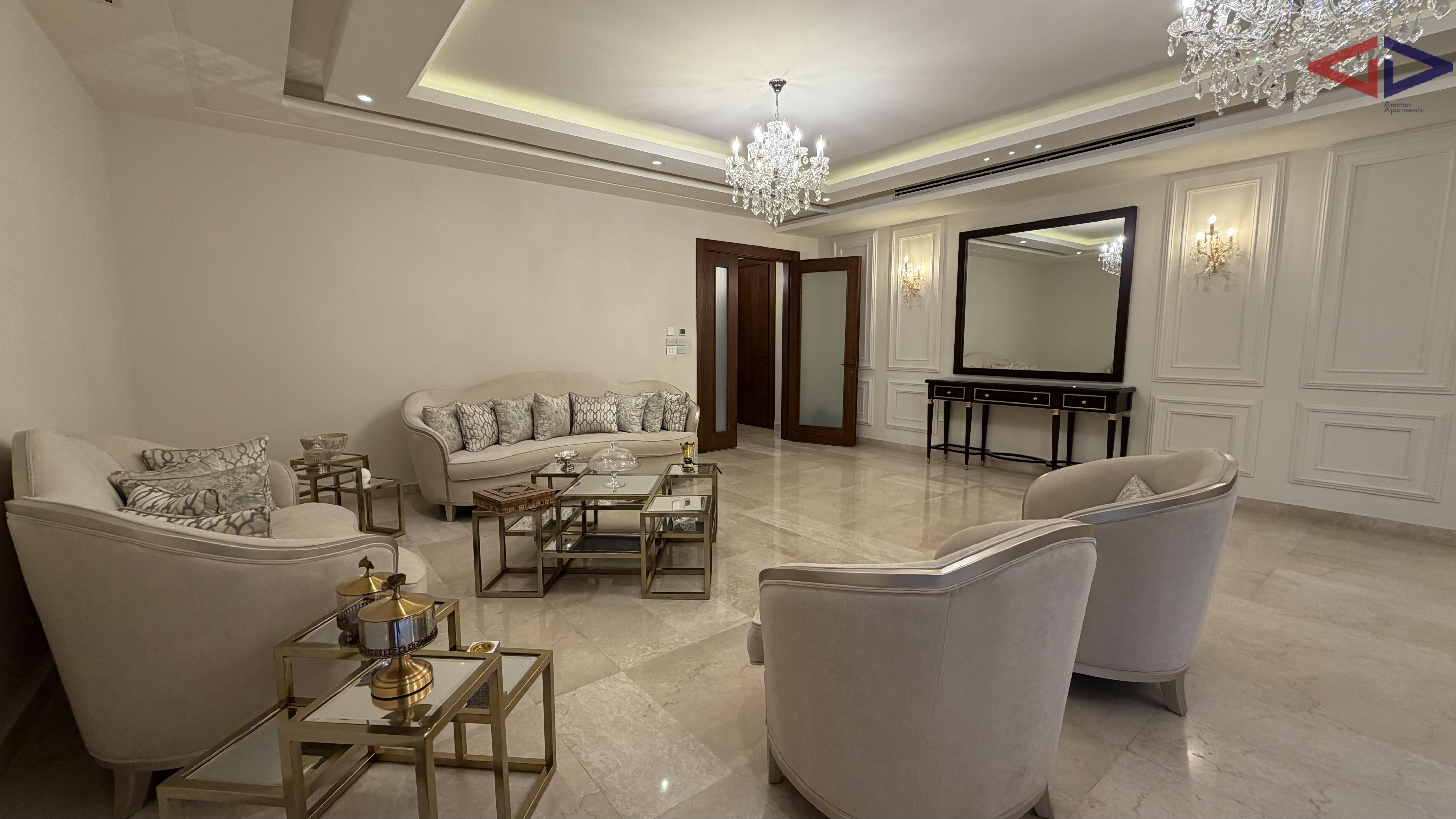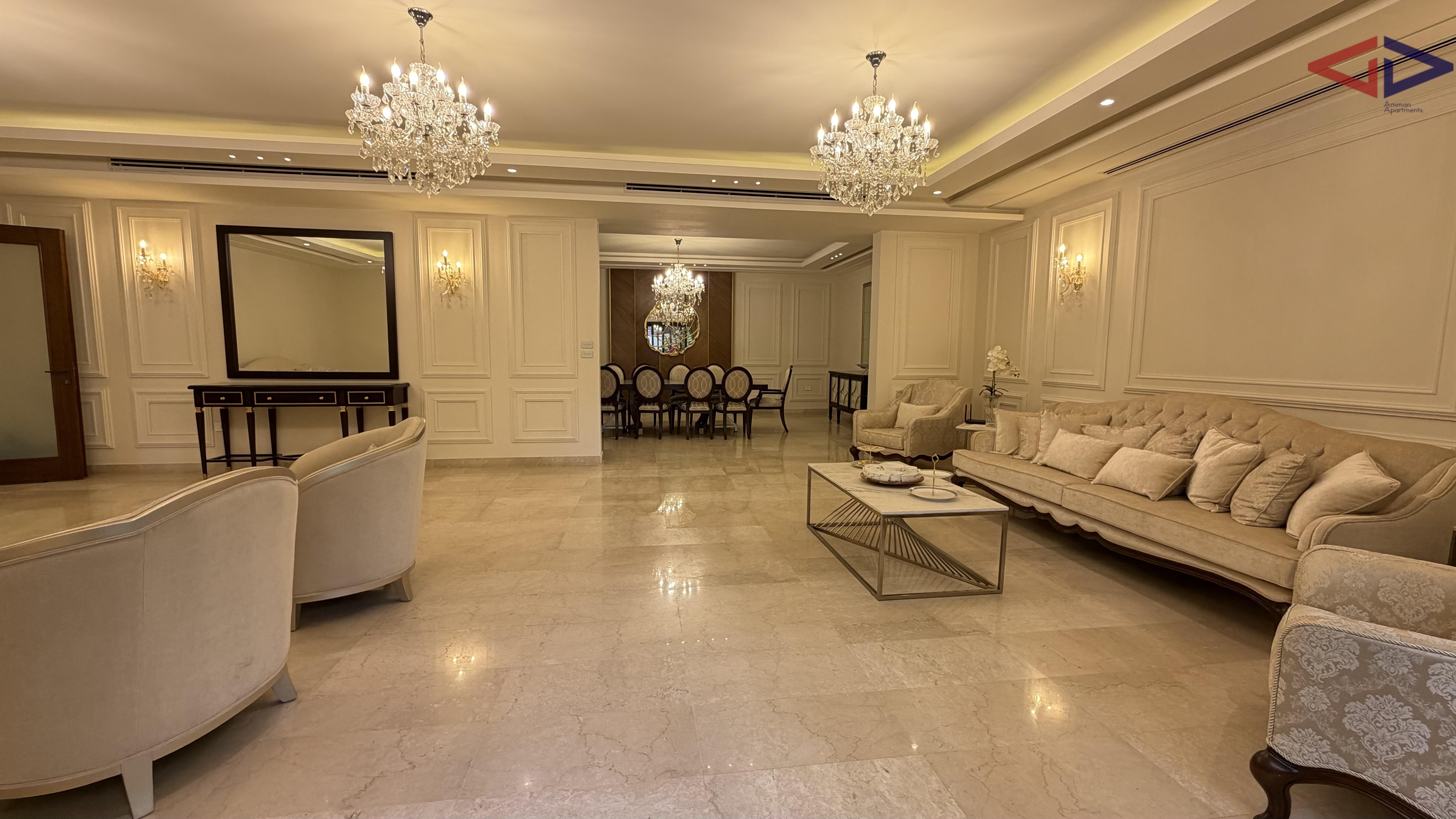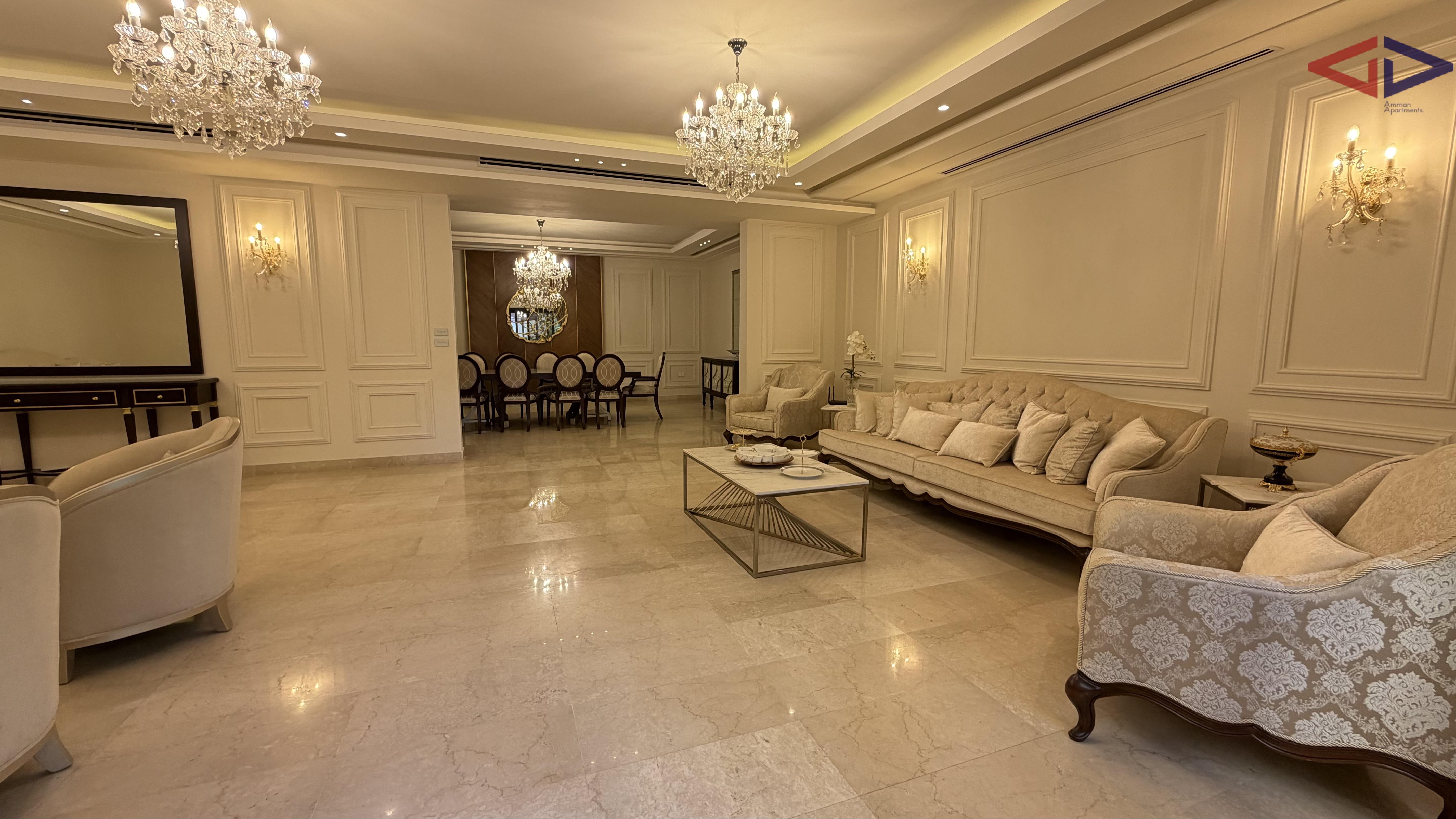 Spacious and elegant three-bedroom apartment for rent in Abdoun, Amman, featuring 250 sqm internal living area and a 150 sqm private terrace. The apartment offers bright and airy living spaces, a modern and well-planned layout, and a large terrace ideal for outdoor seating, entertaining, or family gatherings.