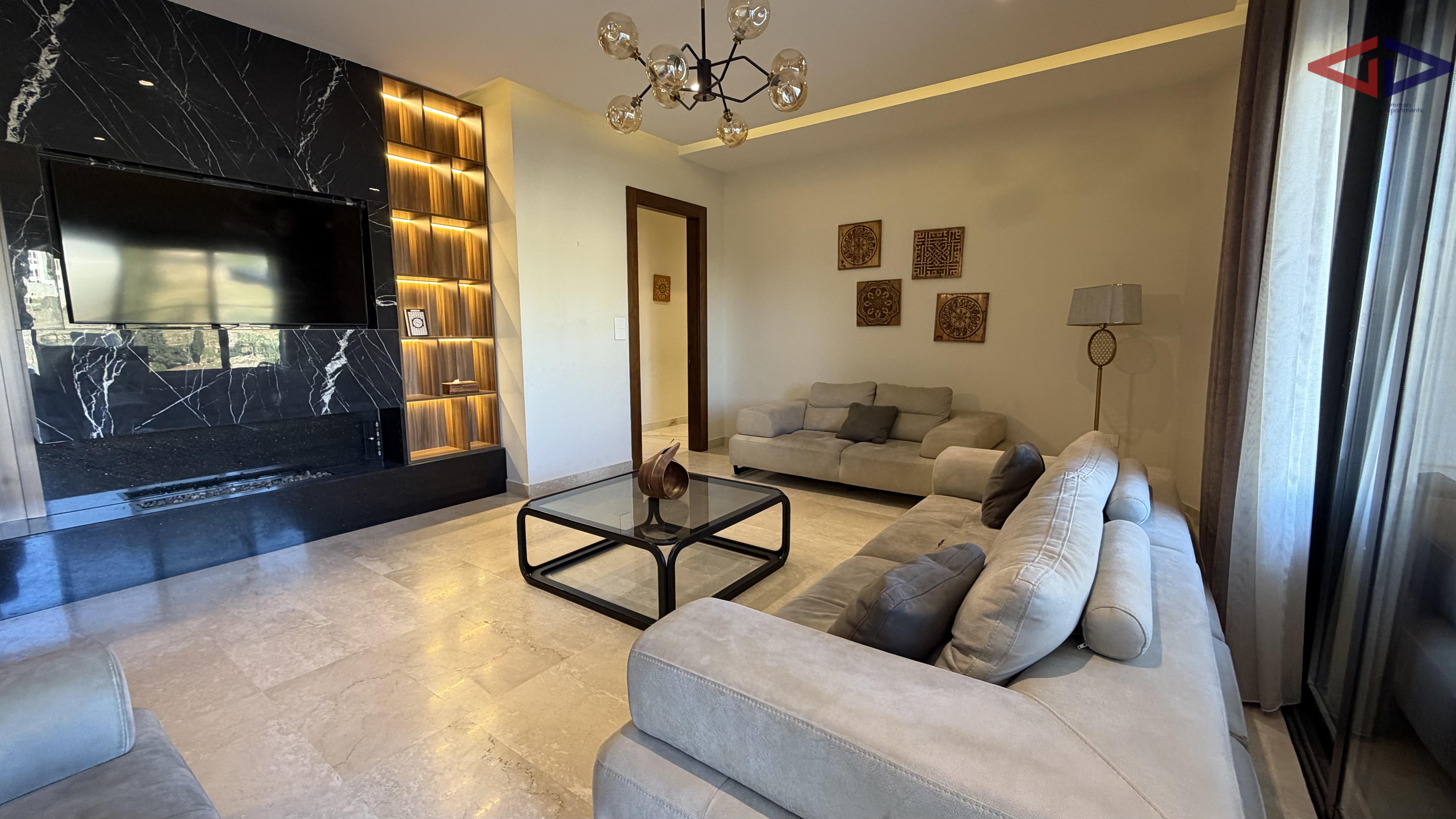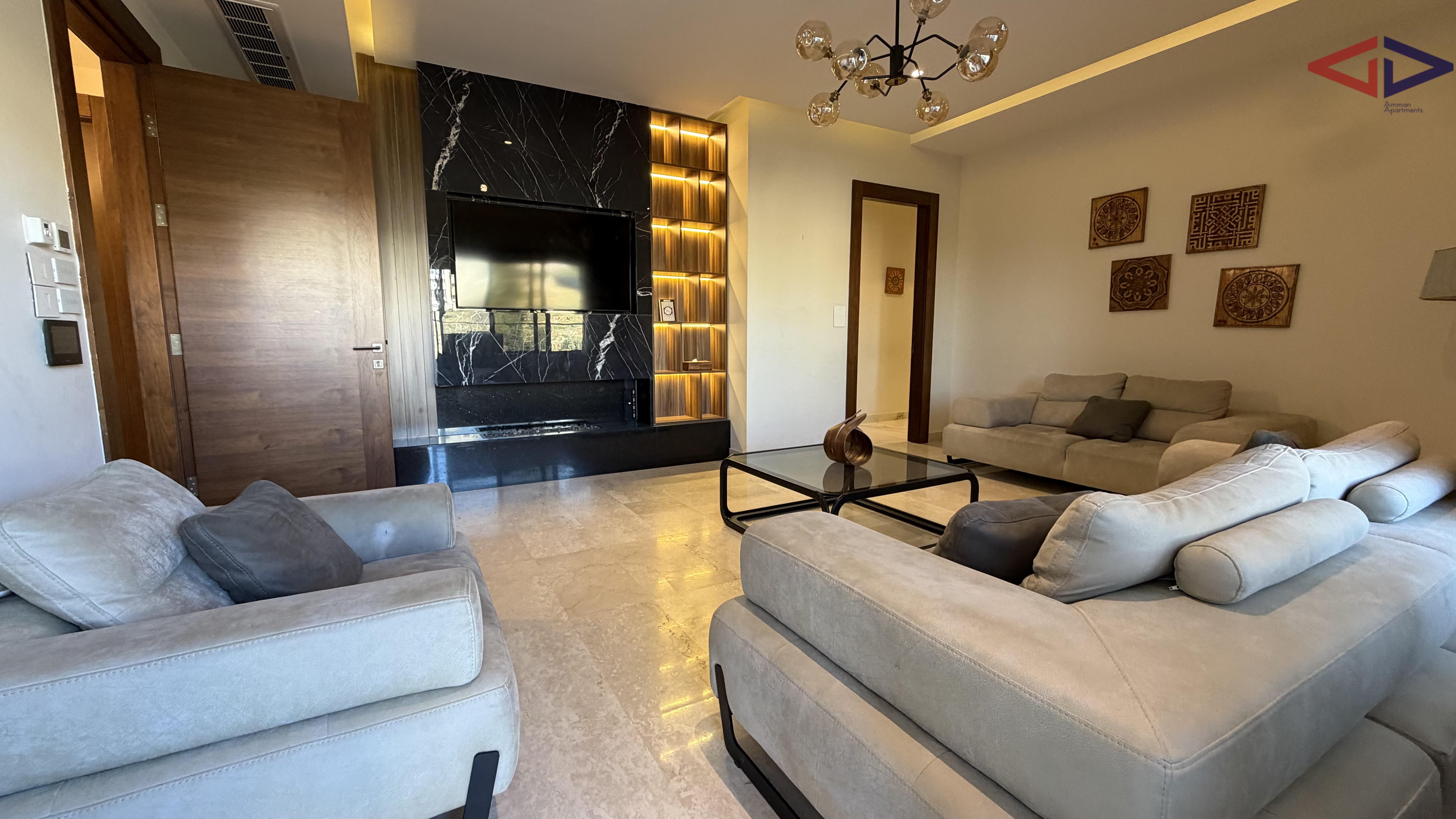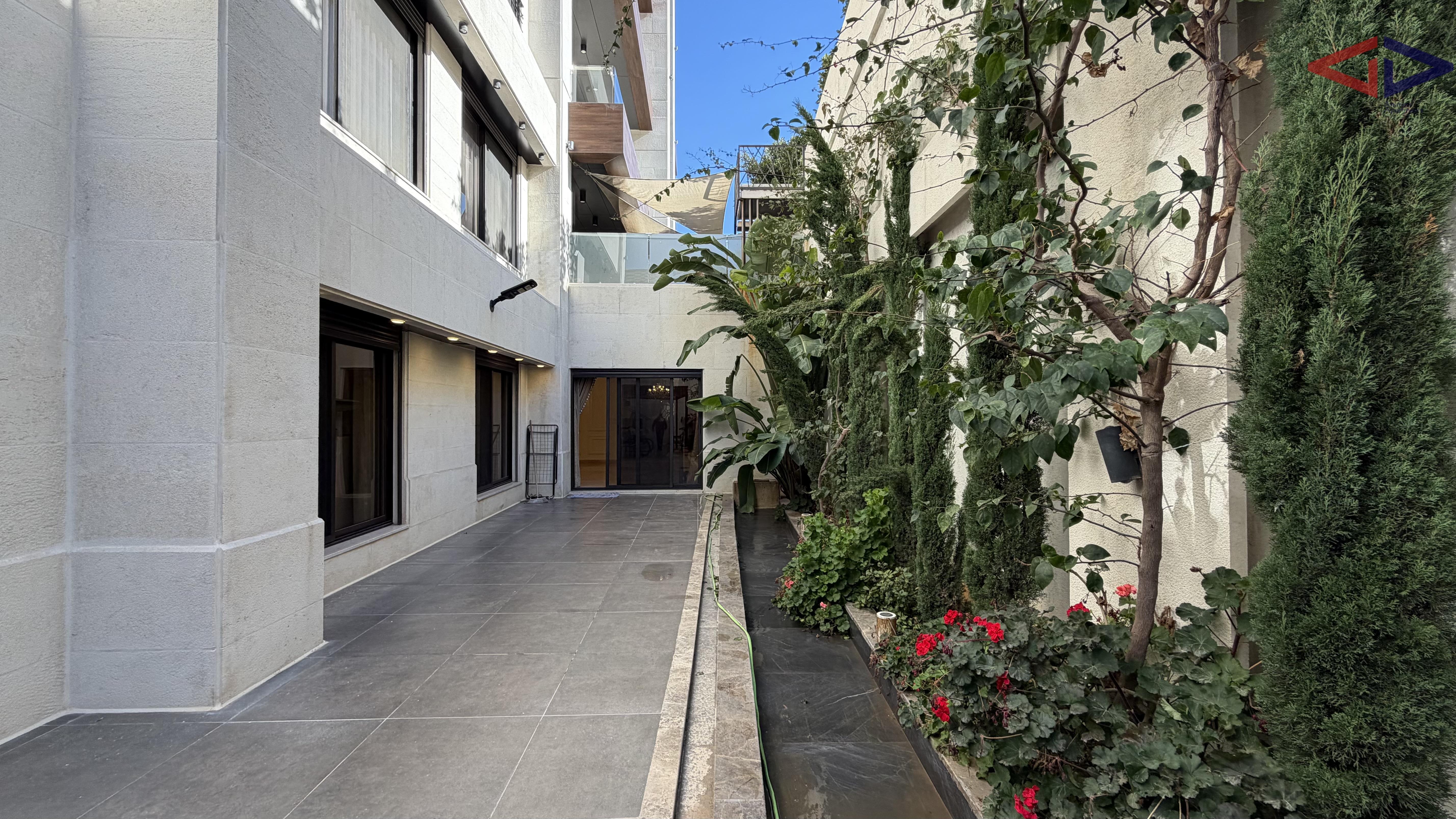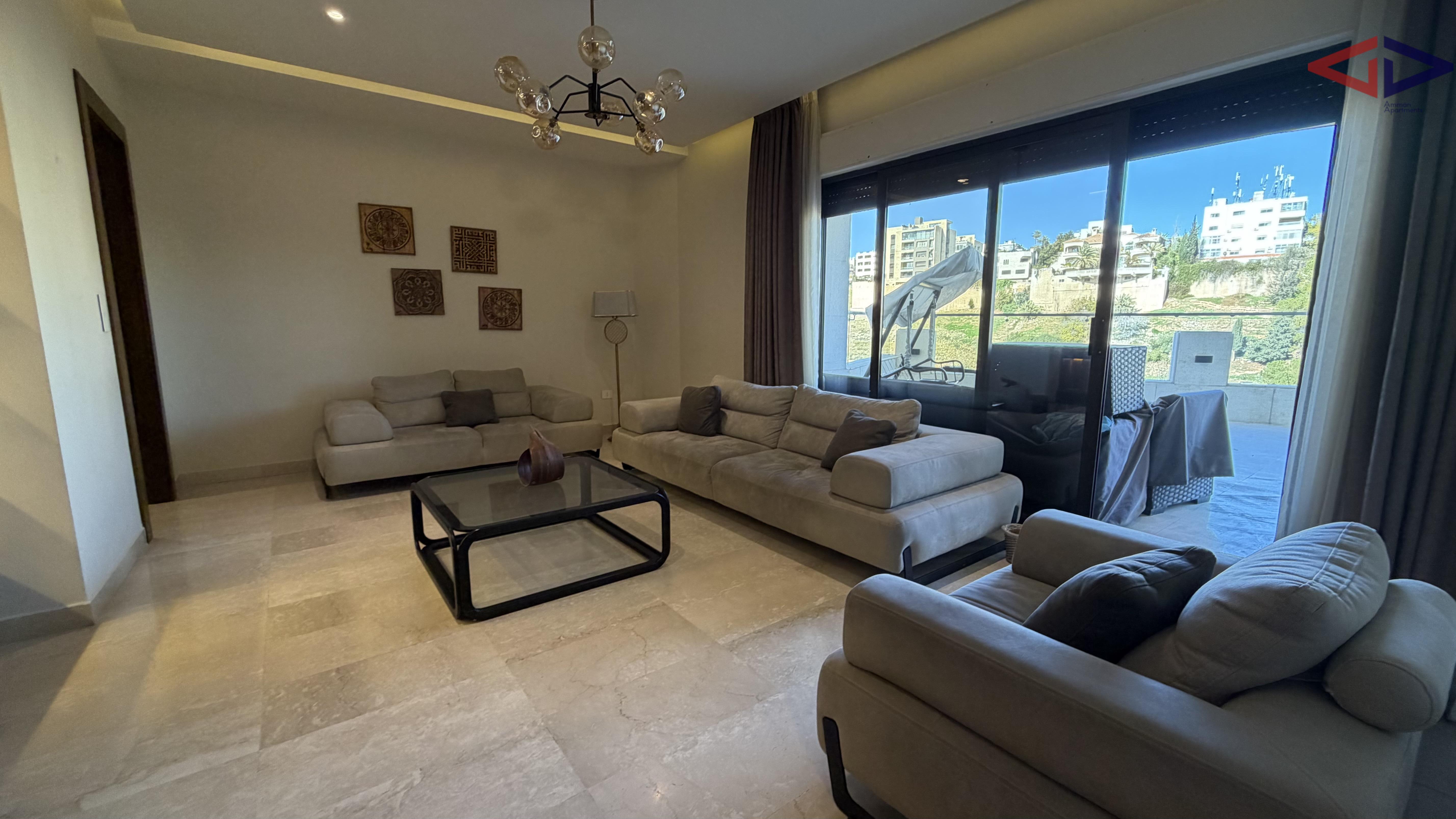 Spacious and elegant three-bedroom apartment for rent in Abdoun, Amman, featuring 250 sqm internal living area and a 150 sqm private terrace. The apartment offers bright and airy living spaces, a modern and well-planned layout, and a large terrace ideal for outdoor seating, entertaining, or family gatherings.