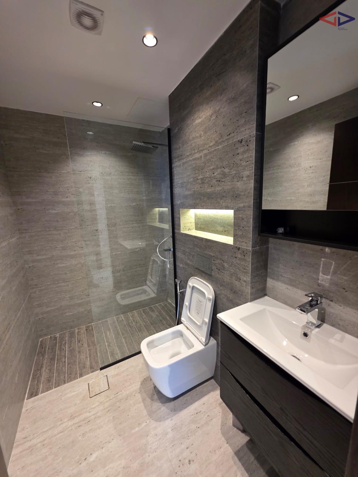 The apartment includes two comfortable bedrooms and two modern bathrooms finished with clean, contemporary touches. The bedrooms offer privacy and functionality, making the home both practical and welcoming.
